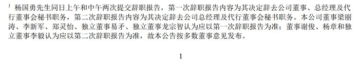 值得注意的是,振芯科技3月30日发布的公告中有个备注,内容显示,杨国勇先生同日上午和中午两次提交辞职报告,第一次辞职报告内容为其决定辞去公司董事、总经理及代行董事会秘书职务,第二次辞职报告内容为其决定辞去公司总经理及代行董事会秘书职务。本公司董事梁丽涛、李新军、郑灵怡、独立董事易矛、独立董事龙宗智认为应以第一次辞职报告为准;董事谢俊、杨章和独立董事李毅认为应以第二次辞职报告为准,故本公告按多数董事意见发布。