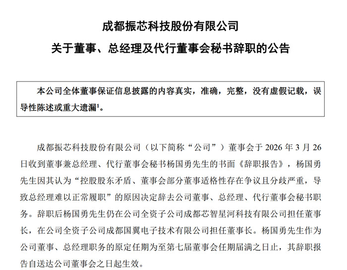 振芯科技30日发布的公告显示,公司董事会于3月26日收到董事兼总经理、代行董事会秘书杨国勇先生的书面《辞职报告》,原因是杨国勇认为“控股股东矛盾、董事会部分董事适格性存在争议且分歧严重,导致总经理难以正常履职”,因此决定辞去公司董事、总经理、代行董事会秘书职务。